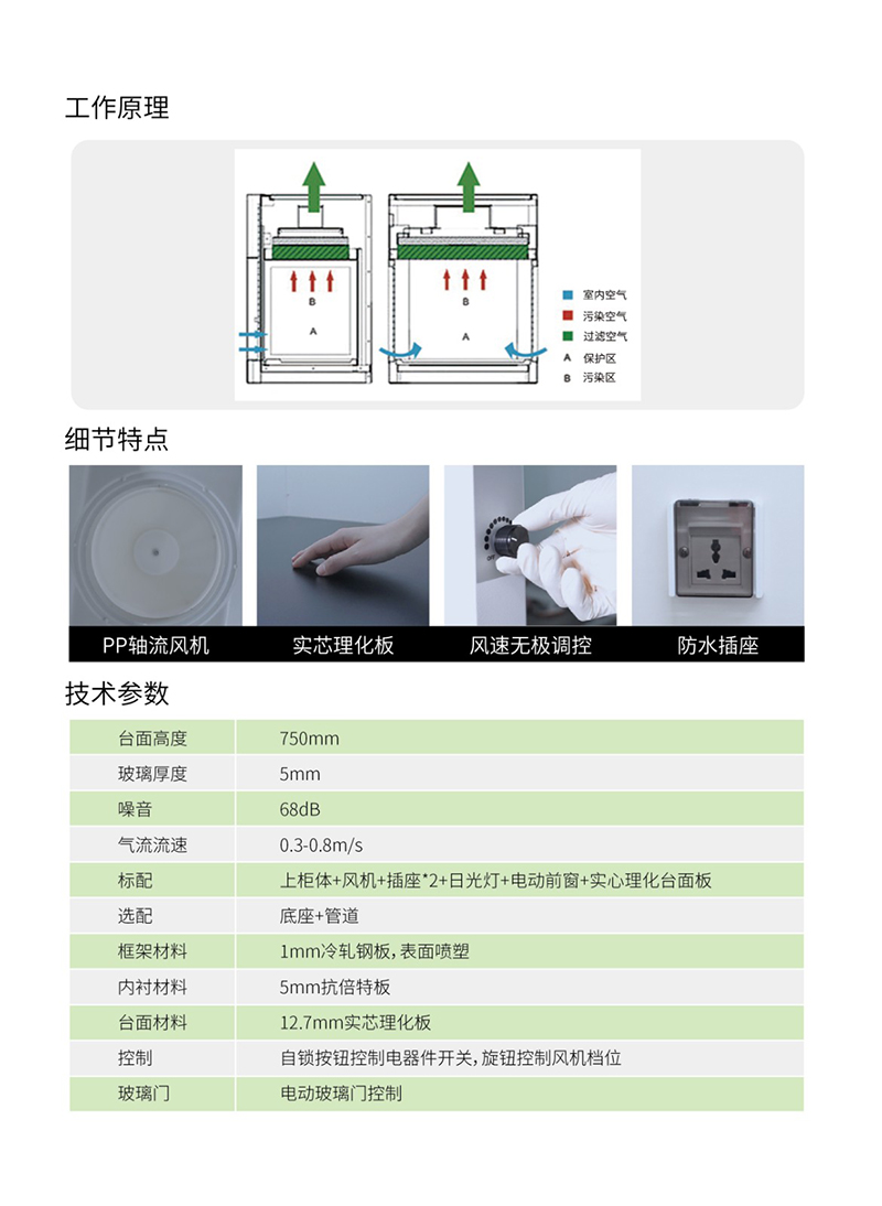 1.通风柜前视窗为电动视窗,可以在行程范围内的任意高度停止,通过自弹船型开关控制,分别按上、下